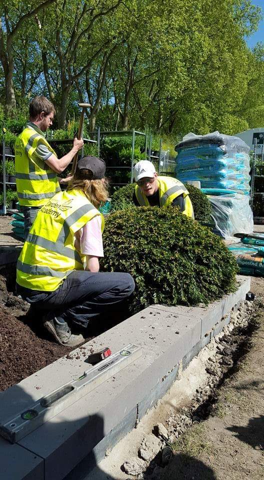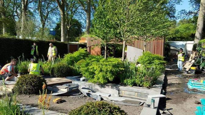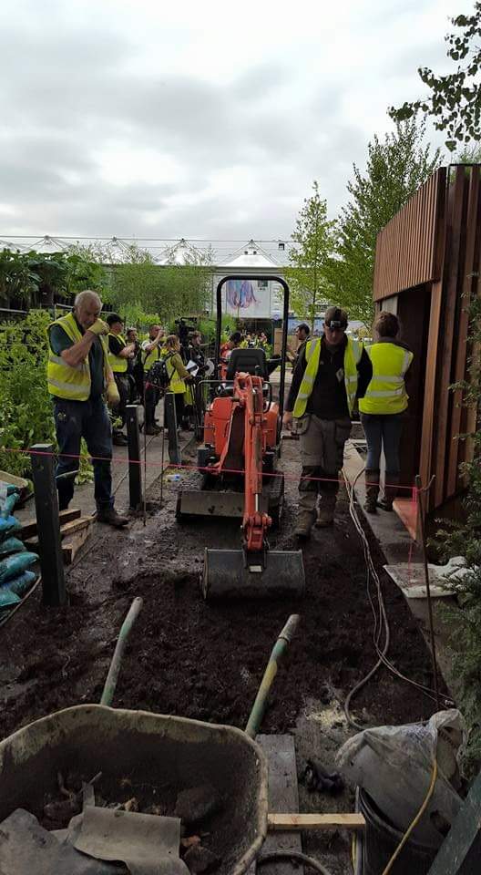 I was quite lucky for my first day of the build, as arriving late (which I was made very aware of by the rest of the Bee’s in jest), I avoided the crack of dawn scramble to get to the showground and work right through till dark. My first job for arriving late; make tea for all those who had been on time. I would however not be so lucky the next day and waking up in the dark (I’m not a morning person) and working until dark in May, is a massive shock to the system, especially for someone who needs a routine. I kept telling myself why I was doing this and put on a brave face, to hide the internal battle and struggle I was having with my mind and body. I was both excited and apprehensive. Whilst it had been talked about in the lead up to coming here, about how difficult building a show garden can be; until you have been there and witnessed for yourself the time and effort that the designers and landscapers put into creating the gardens; it is unbelievable. I have a newfound respect for what they give to creating these spaces and the programme on TV, really does not do justice to the work they put in.