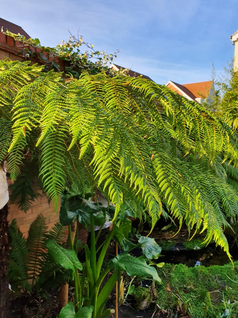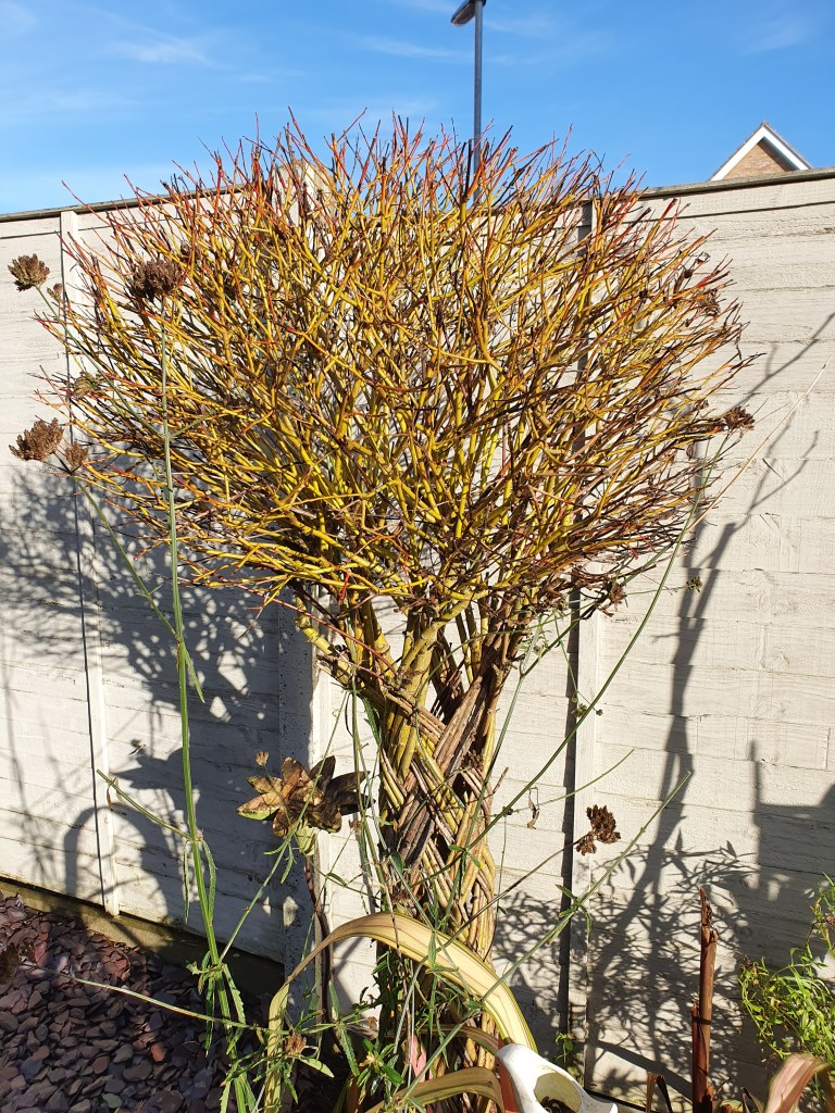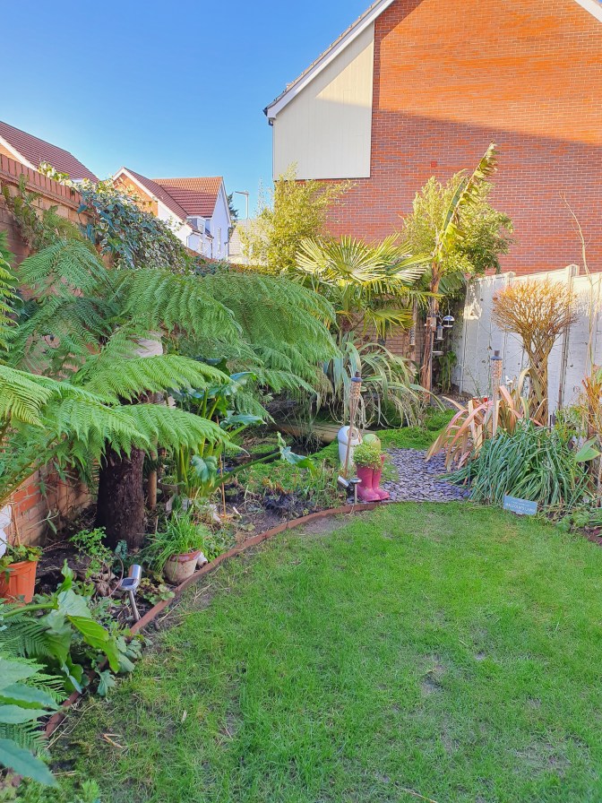 I can now see parts that were once hidden from view; the bones of a garden; the structure and architectural shapes, which gives the garden it’s character. Such as the Trachycarpus palm evident before, yes, but now in winter, it becomes the striking tropical focal point; with its large leaves fanning out from the centre of the garden. This is under planted with the arching strappy leaves of the Phormium, which delicately dip into the now clearly visible pond, which had been mostly hidden from view amongst dense foliage throughout the summer. Both these plants help to create a tropical feel and make themselves at home in a UK garden. The lush foliage of the tree fern (Dicksonia antartica) remains all year and the dense rhizome trunk is now clear to see; as are the honey colour stems and structure of the braided Willow. So far my Hardy bananas which don’t typically like the cold and wet (much like me) have remained unwrapped, enjoying the milder weather.